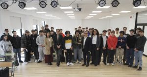 Alumnos do IES A Basella coa directora xeral de Ordenación e Innovación Educativa, Judith Fernández, a directora do centro, Rebeca García Rodríguez, e o xornalista da APG Alberto Avendaño.
